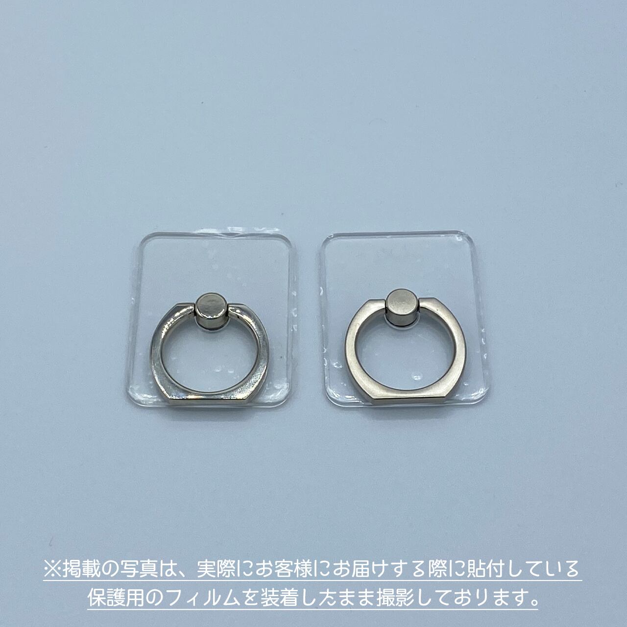 スマホリング本体と、貼り付け用の接着パッドを同梱してお届けします。お客様自身で接着パッドを台紙から剥がして装着する形になります。